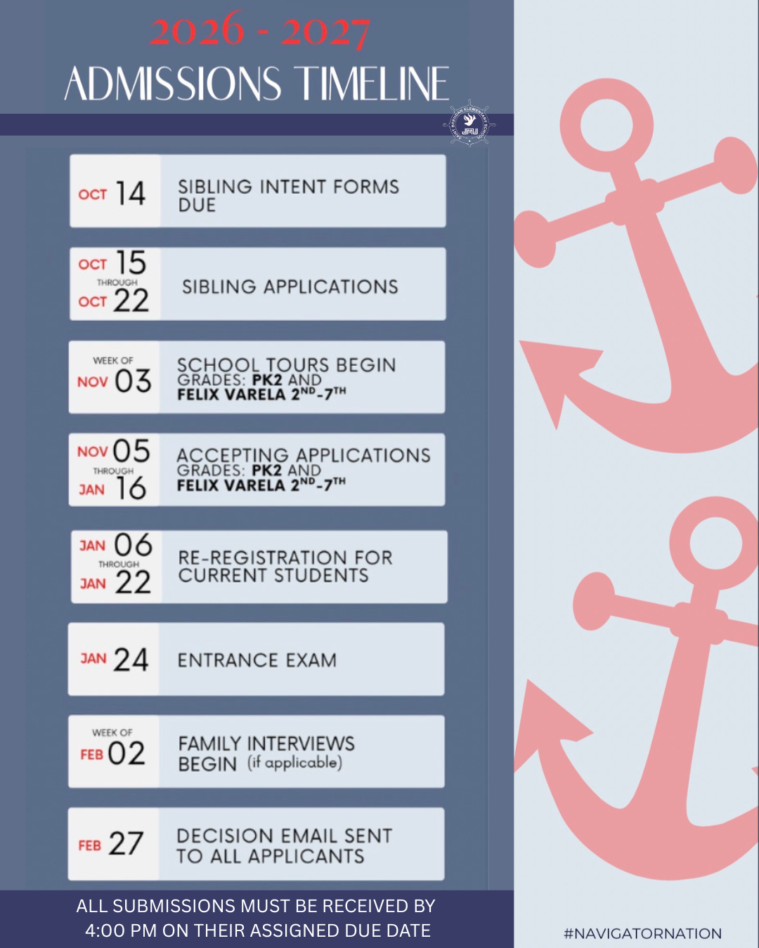 As our school’s mission encompasses the Catholic Christian formation, it is essential that the families demonstrate and understand the specific Christian nature of our school. Therefore, the school will accept only those children whose parents desire is to take part in that mission through participation in regular mass attendance and parent volunteer hours in church/school related functions. With this in mind, we must remind you that by being the primary role model to your children, you must also comply with said regulations stated in this manual. In matters of admission and registration, the decisions of the pastor and principal are final.